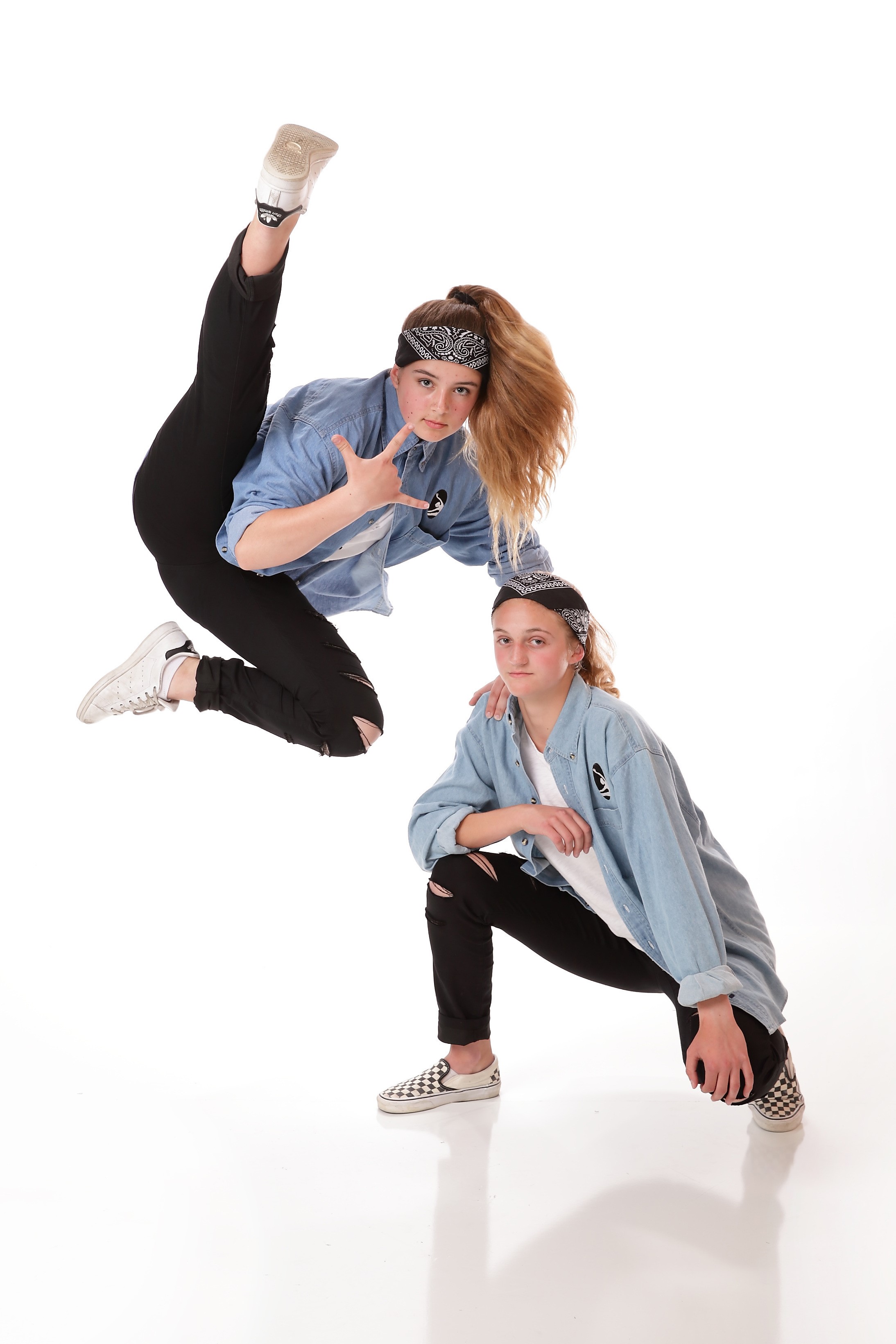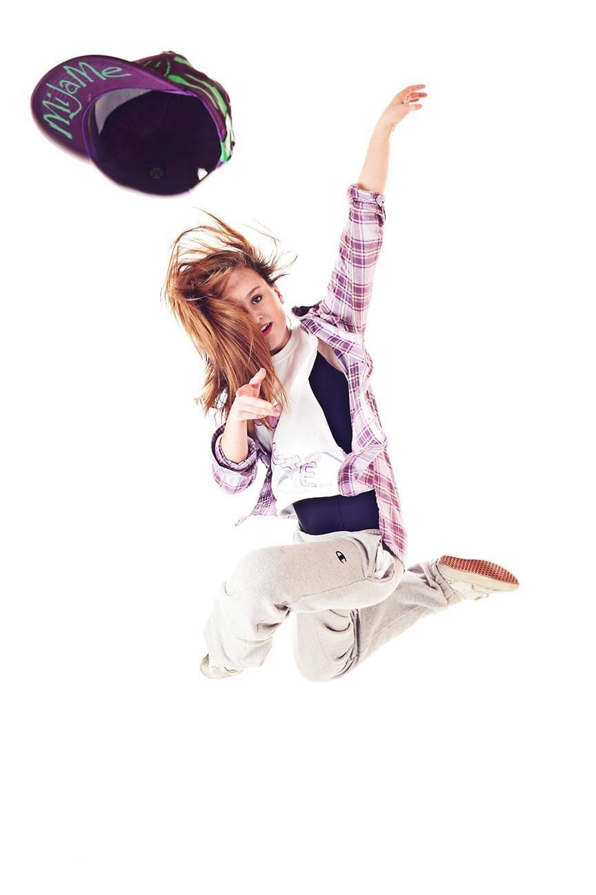 Tight fitting dance tops and baggy pants, clean sneakers or jazz sneakers (for studio use only). No loose shirts.